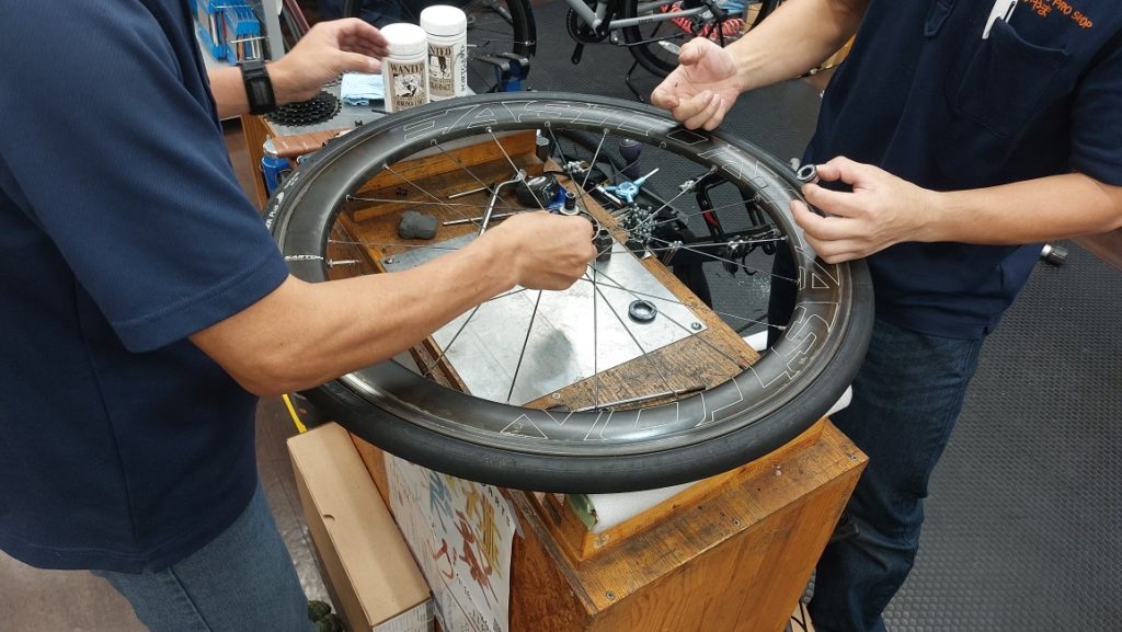作業台にのせられたホイールを見て、、、、、。