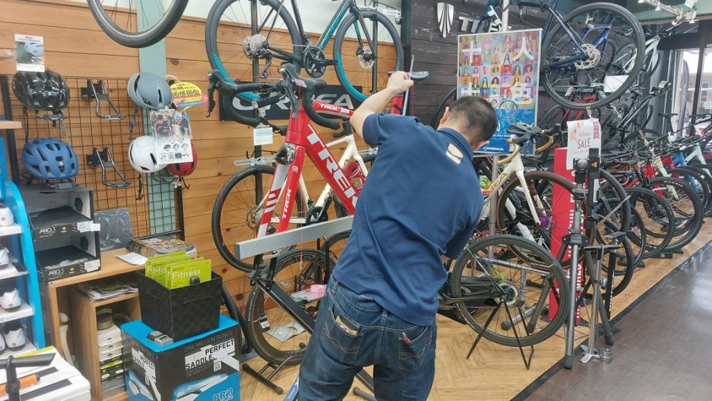 と、店長が後輪のホイール点検をしてくれていると同時に店員N氏がマドン号を作業台にセットして寸法取り!!