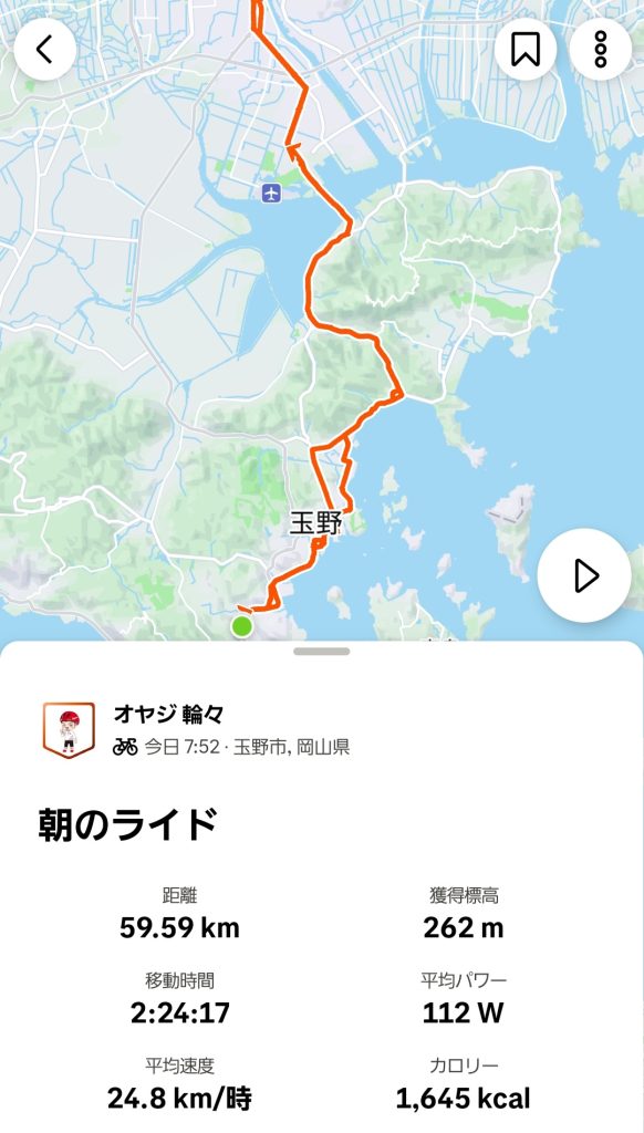 輪:もう少ししたら止むみたいやな……。予定では児島半島をグルッと周ってから自転車SHOPに行くつもりだったけど14時からまた雨みたいだし最短距離でSHOPに行って用事を済ませたら即行で帰ることにしよう!!
