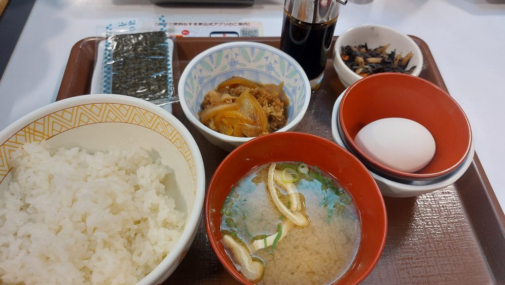 ひじき、ミニ牛皿、生卵が付いた定食:420円