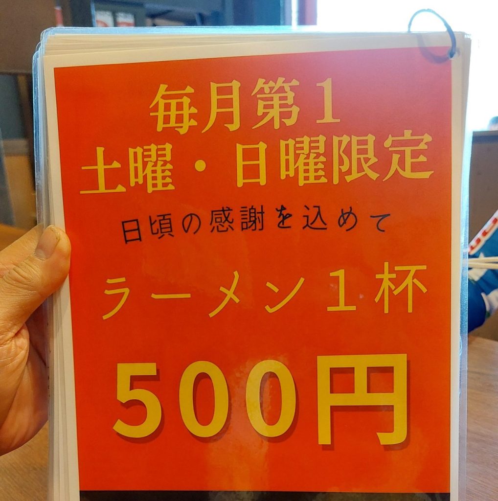 毎月第1 土曜・日曜限定で、ラーメン1杯500円とご飯おかわり無料!!