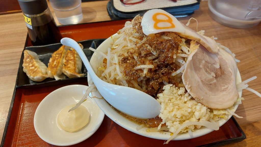 輪:よく分からんな~? 野菜マシマシ?喰えるかな! ニンニクはマシ!! 背脂もマシ!! にしとくか!! マヨネーズもあるのか~!! あと~。腹も減ってるから餃子も付けちゃお!!