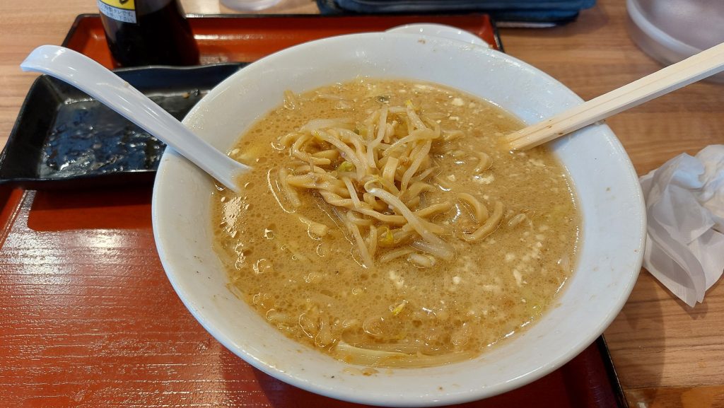 もやしゾーンを抜けて麺が現れた頃には、もうお腹がはち切れそうで数回、麺をすすったらギブアップ!! _( _ ´⚰︎` )_ナンカデル~~