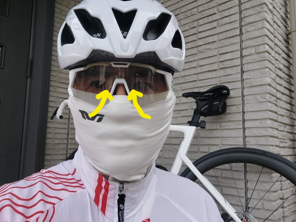 呼吸した息がフェイスマスクの間をぬって上昇してアイウェアを曇らせます!!