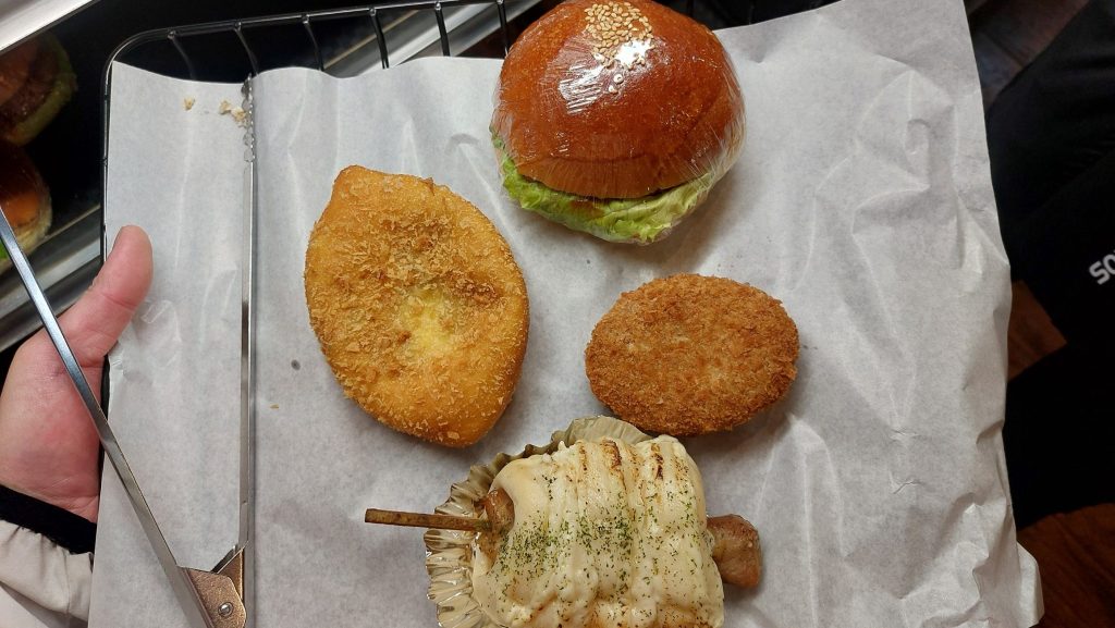 カレーパン、焼き鳥を包んだパン、ハンバーガー、コロッケ
