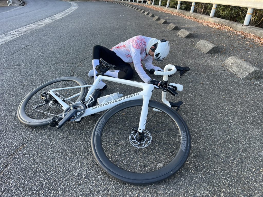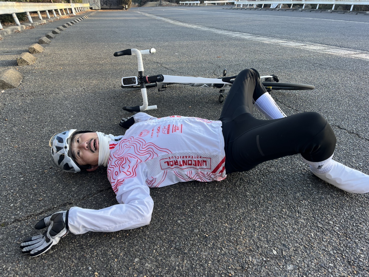 いつもゴール後は、こんな状態でぶっ倒れるんですが本日は田中さんが居たから、ありのままの輪々を撮ってくれましたが、一人の時はある程度、心拍数が落ち着いて1人で写真を撮るので
