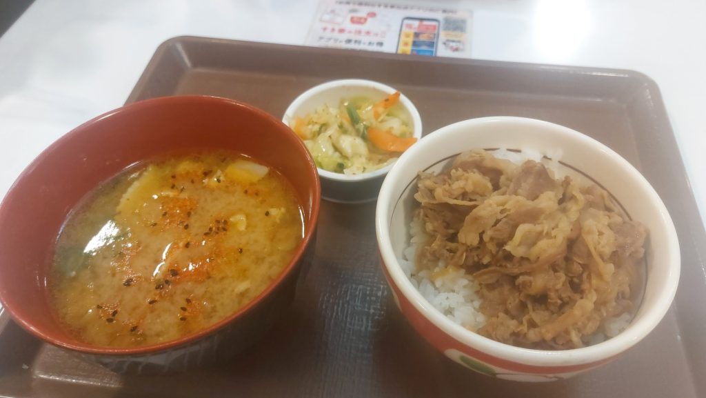 本日もガッツリしごかれるので、いつもの「すき家」で朝食。