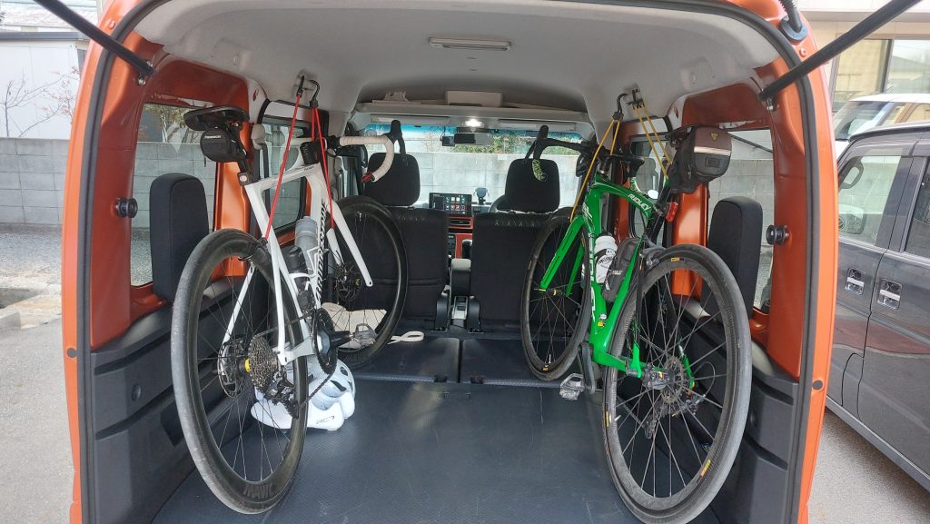 前輪を外さなくても余裕で2台のロードバイクを積み込めてスペースが余るアトレー号は最高っすね!!
